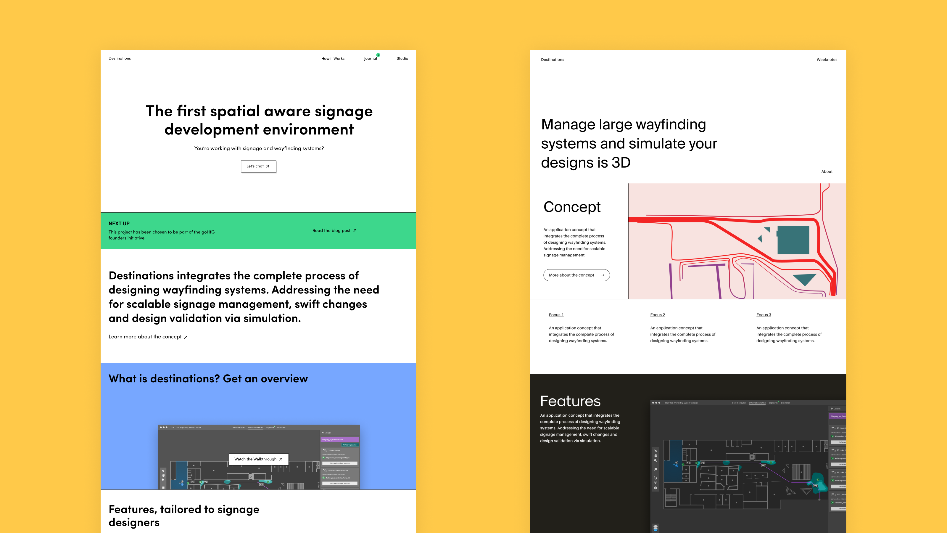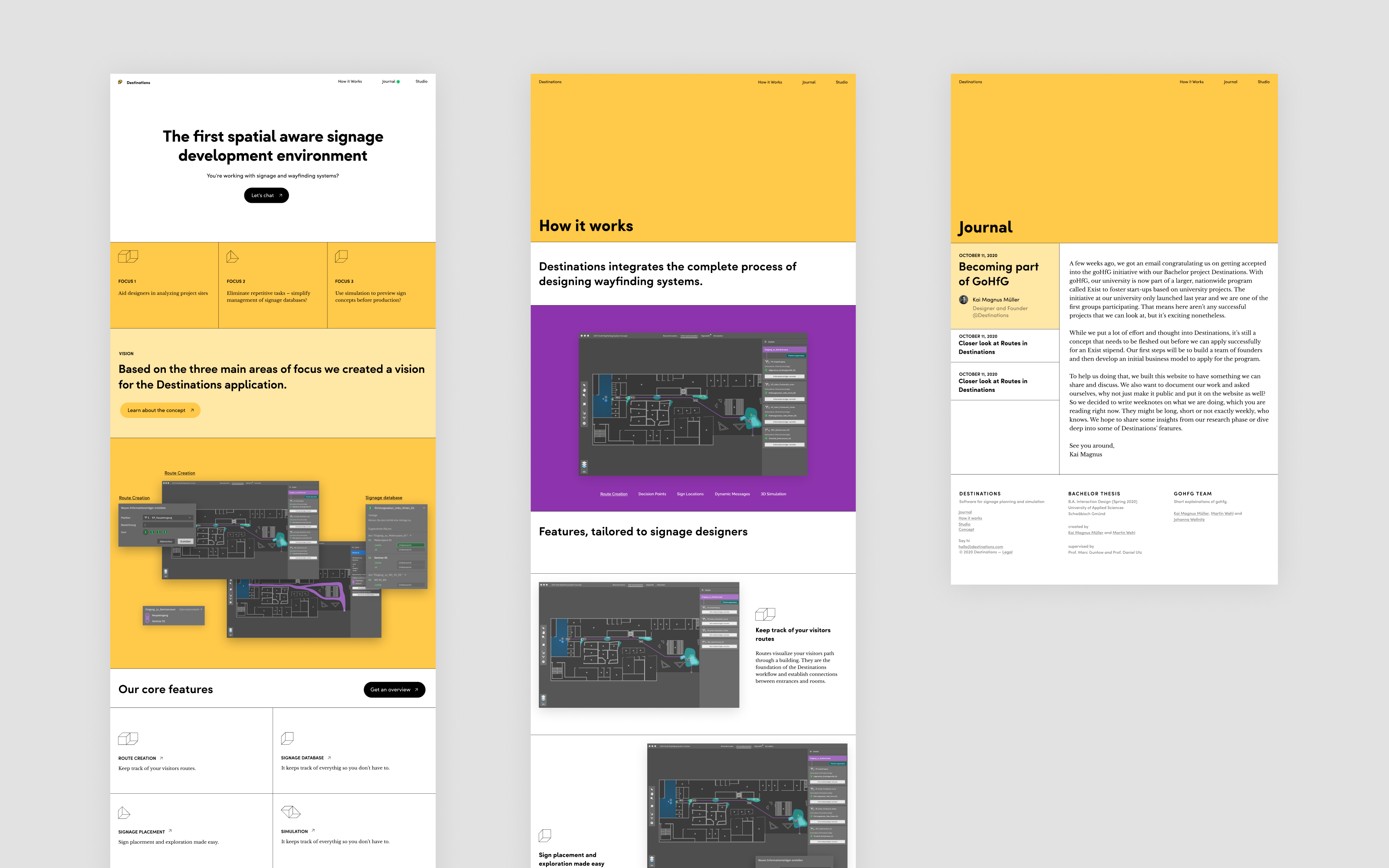 The main page serves as an Introduction to our project with a tagline, the three main goals of our design and a link for further reading about our concept. Next is a collage of our main features acting as an eye-catcher. Below is a list of features similar to our old website and finally a link to our journal.