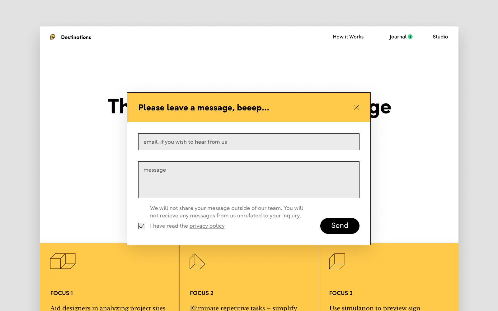 One of our main goals was to get in contact with potential partners or signage designers, get feedback and engage in discussions. For this reason we decided to build a message system instead of a contact email that is usually seen. Visitors can simply write anything they like, without having to worry about writing a whole email and if they want us to respond they can leave their email as well.