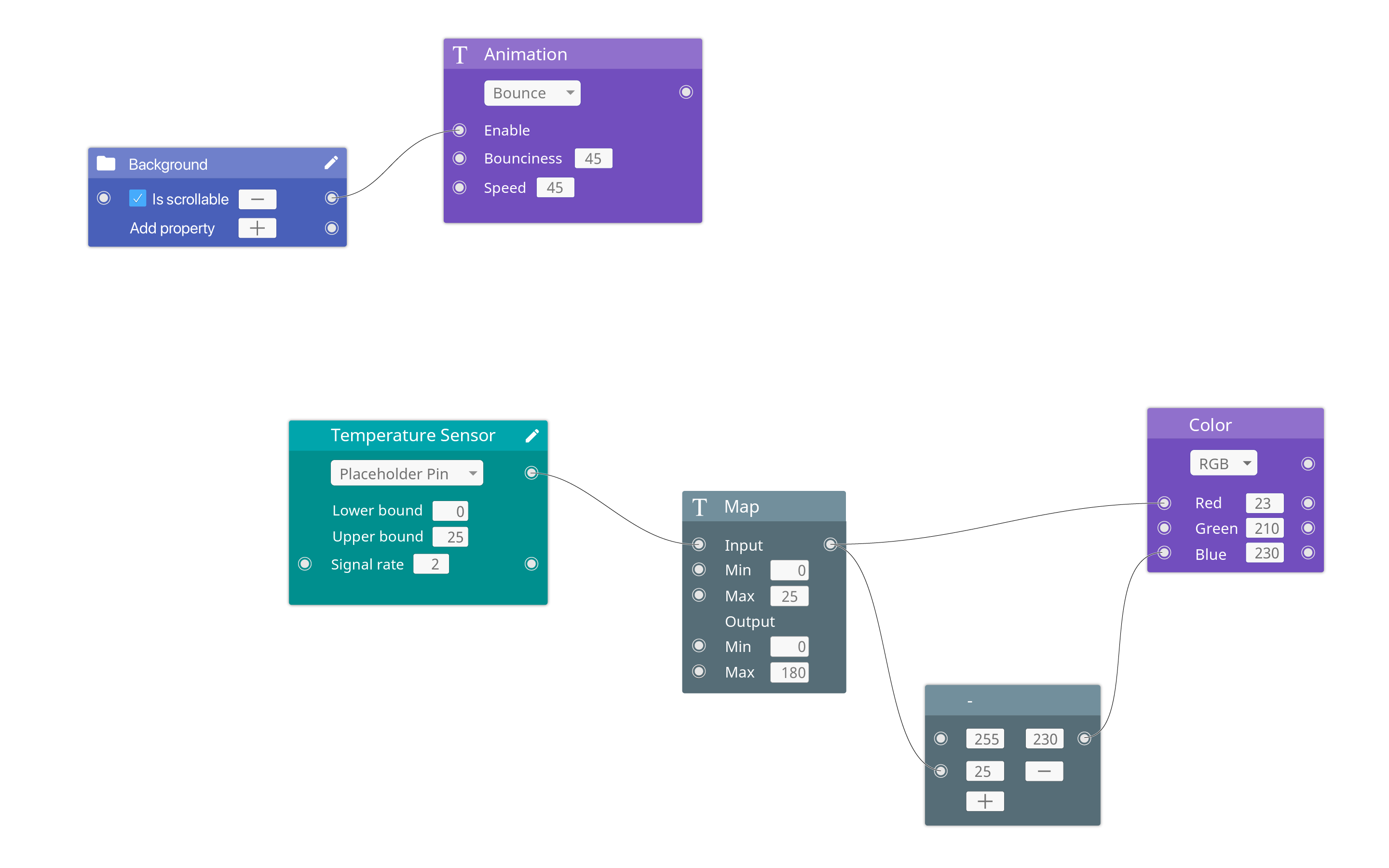 Properties can be added to patches via a plus button. Values can be set manually or are variable via their text field or with a connected input source respectively. When the placeholder pin is set on Arduino patches, the patch itself will generate random values between the set bounds and the current signal rate. This approach combines multiple patches in one to simplify the development process while leaving it open to custom solutions.